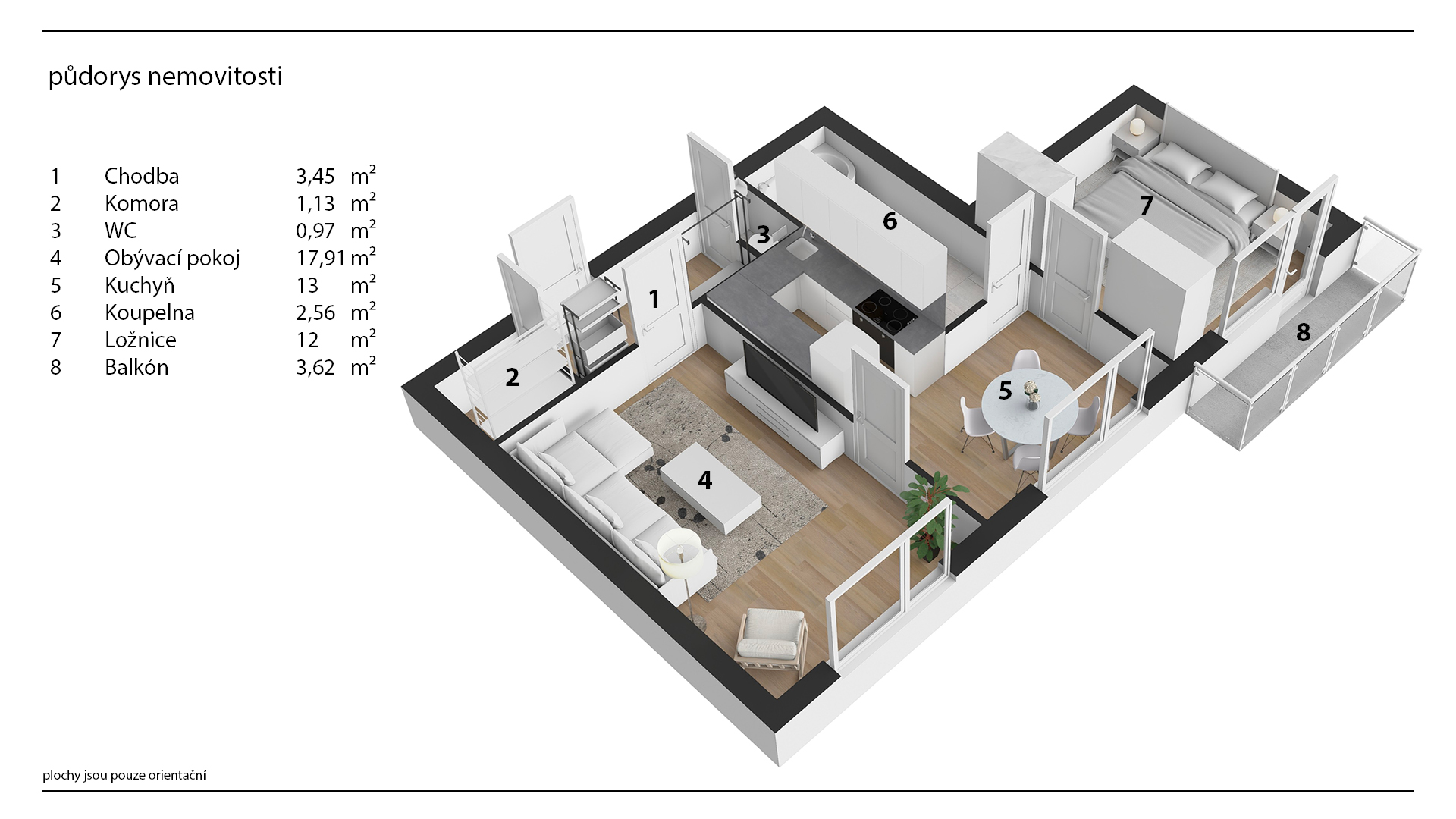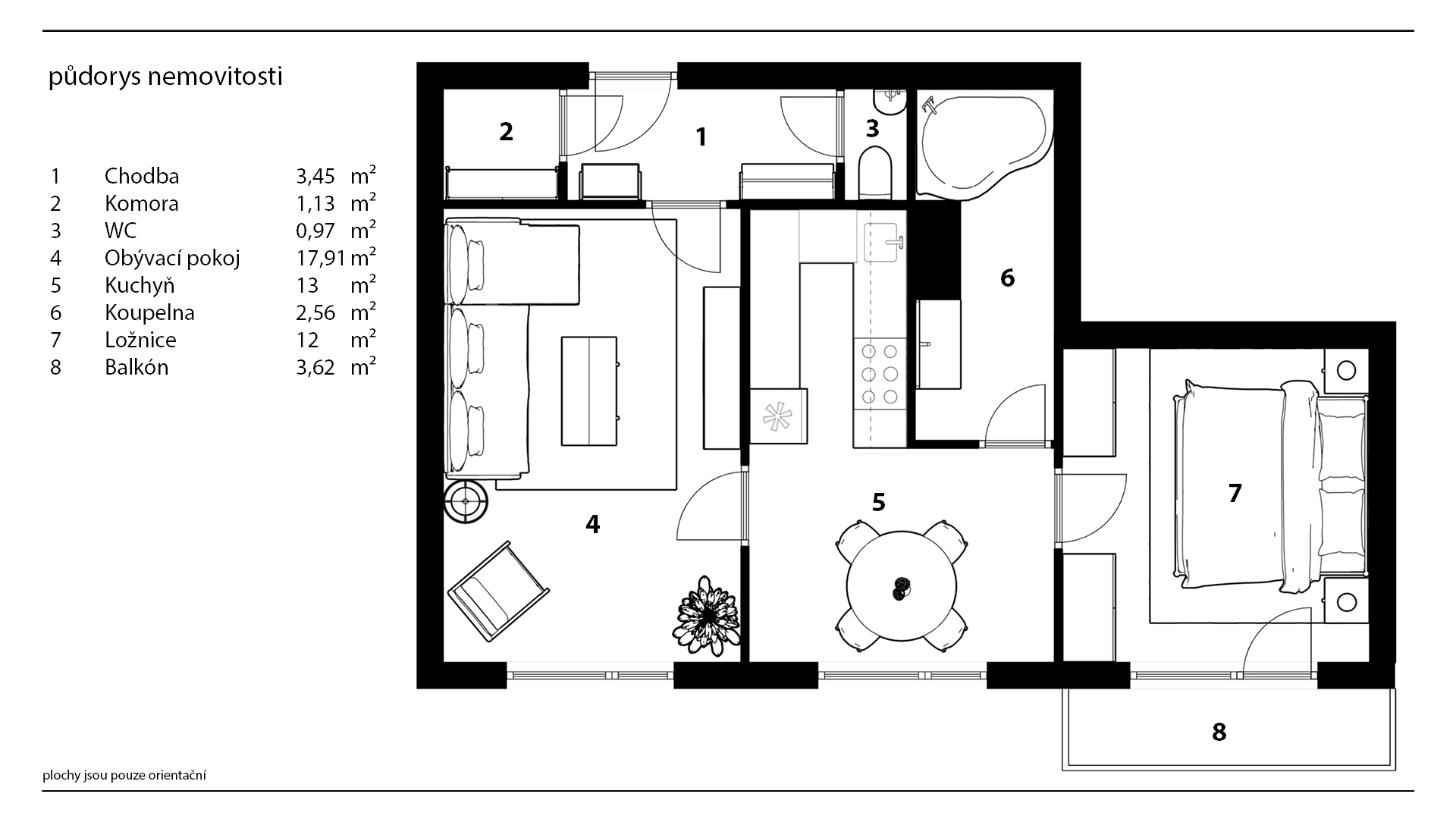 Byt je v udržovaném stavu a umožňuje okamžité nastěhování bez nutnosti větších investic. Dispozici tvoří obývací pokoj, jídelna s kuchyňským koutem, ložnice se vstupem na zasklenou lodžii, koupelna s vanou, samostatné WC a chodba s šatnou.