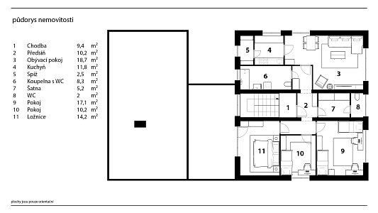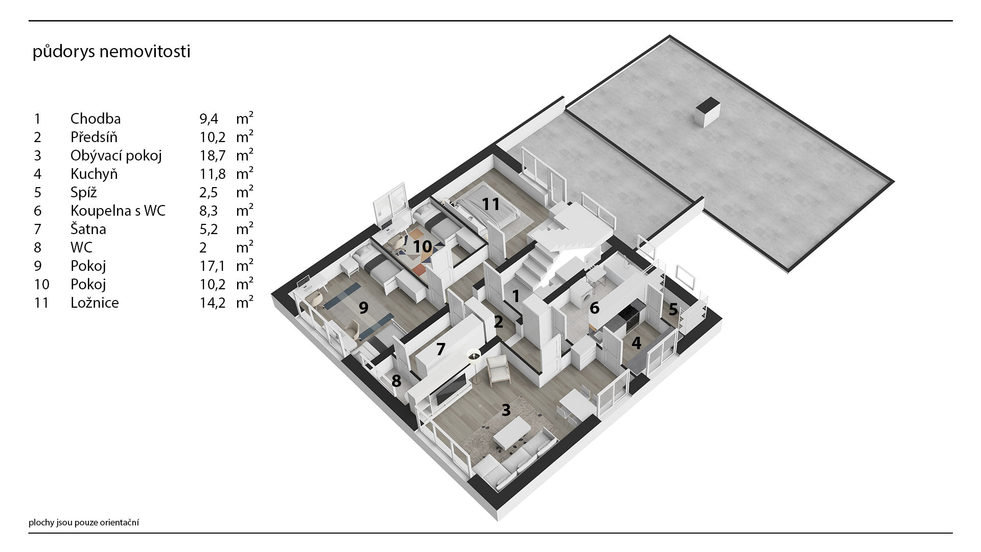 V 1. patře je situován prostorný byt 4+1 s terasou, který poskytuje dostatek soukromí i komfortu pro rodinné bydlení.